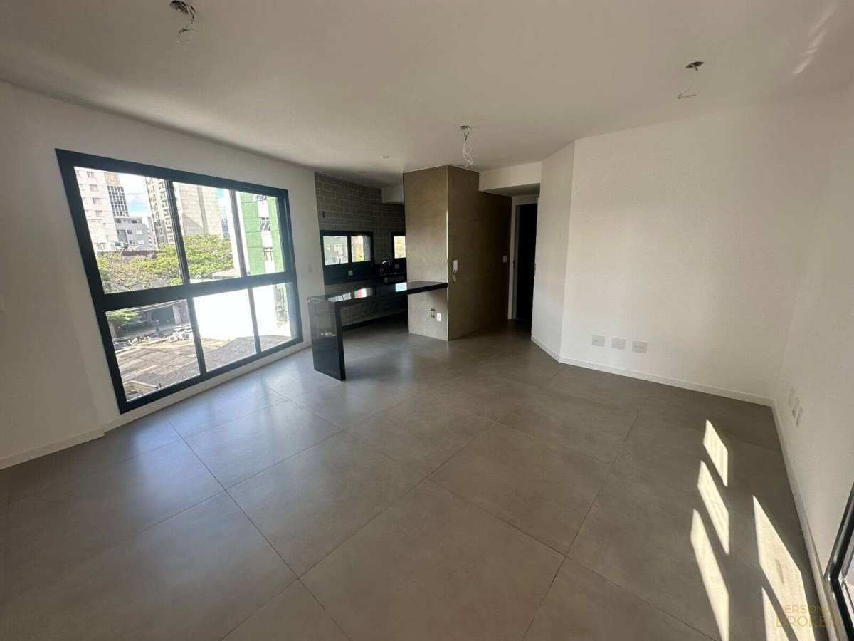 Sala de estar, jantar, circulação e hall do elevador com piso em porcelanato cor concreto